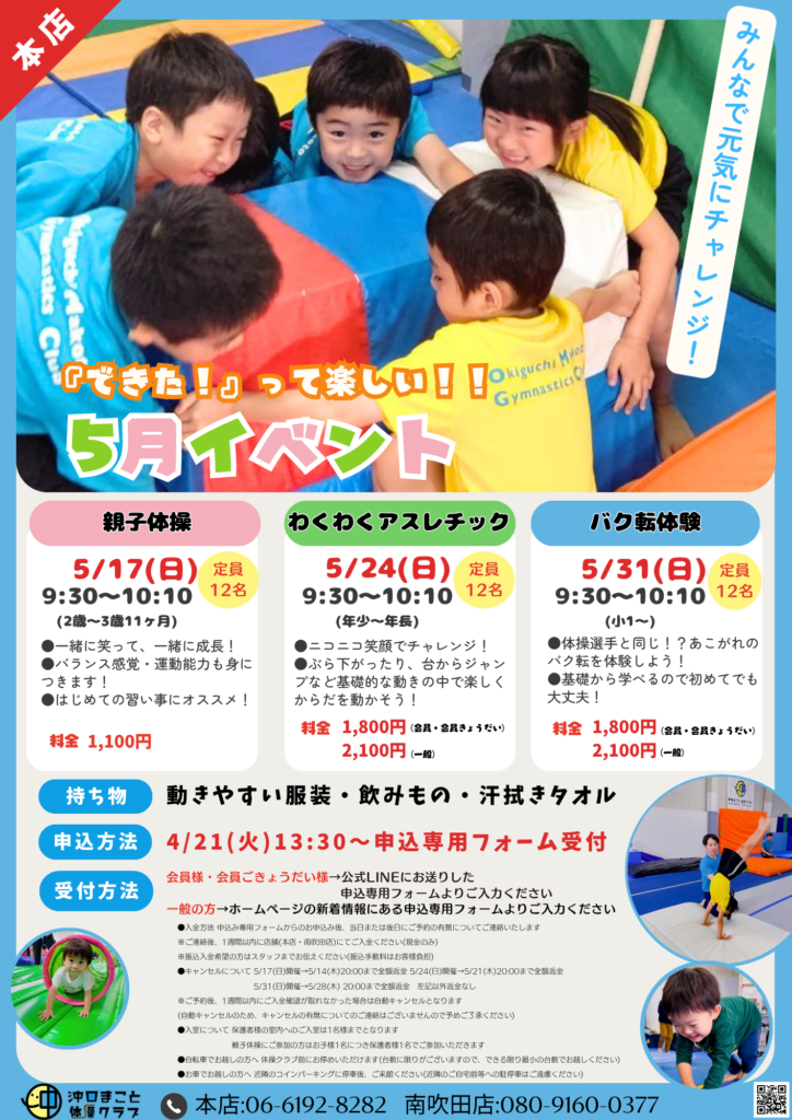 ※4/29(水)~5/6(水)まで年間休講日のため、イベントのキャンセルやお問い合わせ等に関しましては「okiguchi.gym@gmail.com」またはホームページの「お問い合わせ」よりご連絡ください。